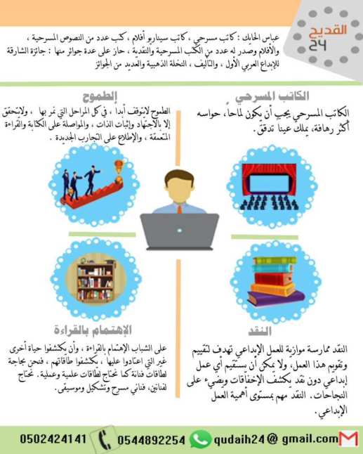 ج : أوجهها أولاً لأبناء ديرتي خاصة من الشباب ، بأن يهتموا بالقراءة وأن يكتشفوا حياة أخرى غير التي اعتادوا عليها ، يكتشفوا طاقاتهم ، فنحن بحاجة لطاقات فنانة كما نحتاج لطاقات علمية وعملية. نحتاج لفنانين ، فناني مسرح وتشكيل وموسيقى . وشكر خاص للقديح 24 ، لهذه الفسحة .