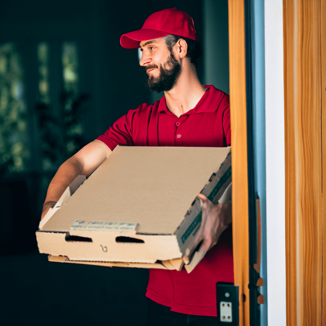 بغضب يفتح الباب، فإذا بعامل توصيل بيتزا آخر على الباب
