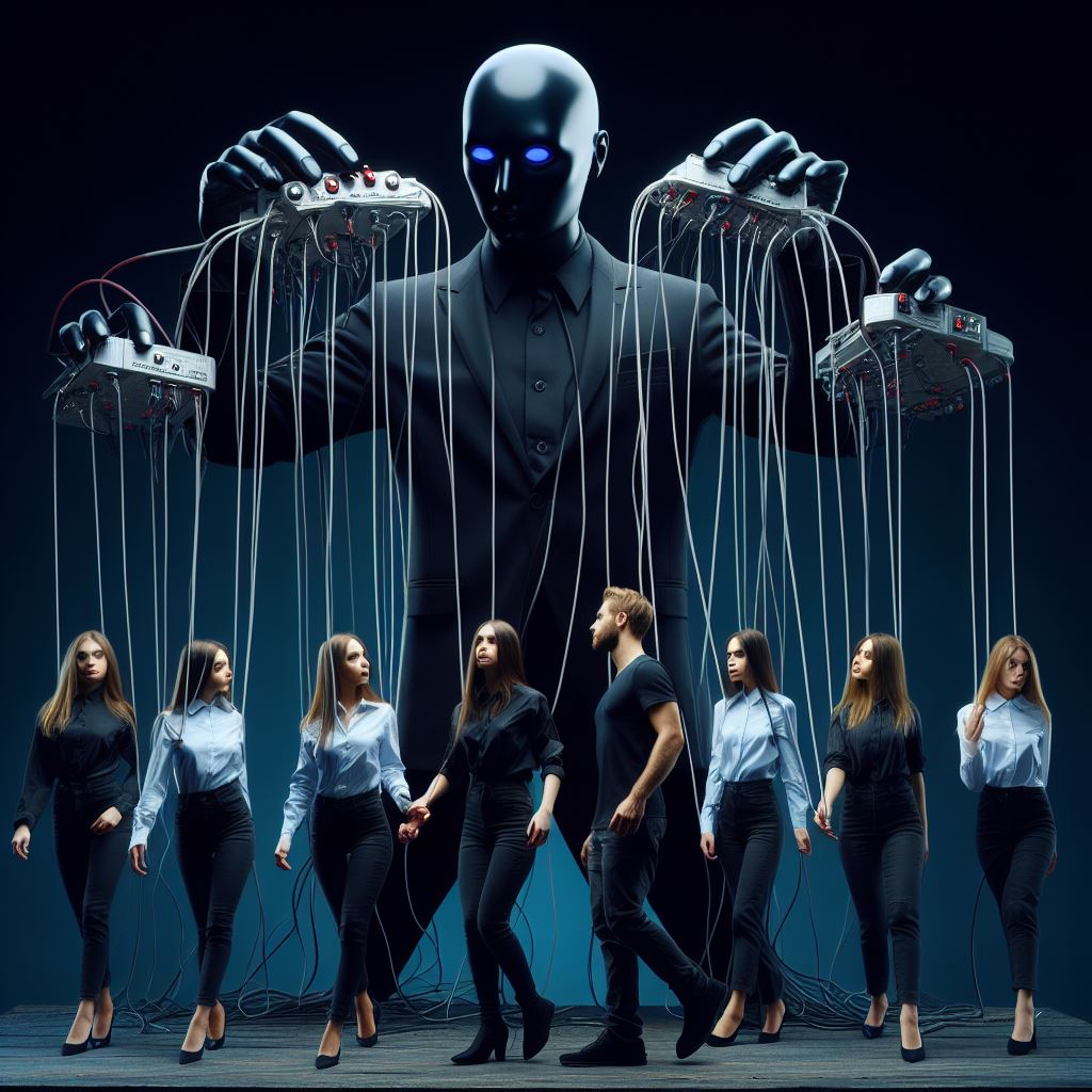 يتجه المسخان ناحية المجموعة، ويبدو الخوف واضحا عليهم، ثم إظلام.. لحظات وعلى صوت مؤثر موسيقي مناسب، تفتح الإضاءة فنشاهد الخمسة على الكراسي والأسلاك موصولة برؤوسهم. الأسلاك تضاء وكأنها تنقل إشارات من أجسادهم إلى لوحة اللوحة الالكترونية، ولكن نلاحظ أن ملامحهم تشي بالمقاومة والرفض.